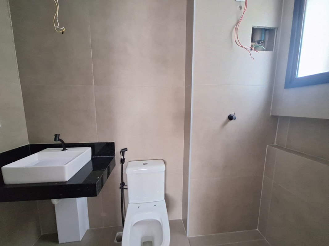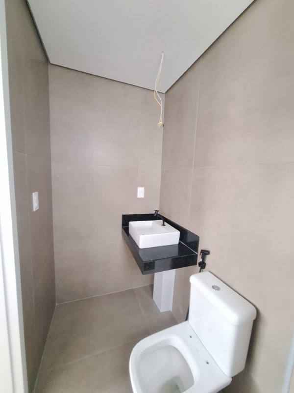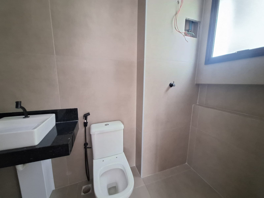 Banho social com bancada granito e piso porcelanato,